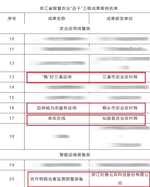 近日,浙江省農業農村廳公布了2023年度浙江省智慧農業“百千”工程成果案例。其中,由浙江托普云農科技股份有限公司(下稱“托普云農”)自主研發的“農作物病蟲害智慧測報系統”成功入選智慧設施裝備類案例;托普云農全資子公司——浙江森特技術支撐建設的“梅”好蘭溪應用、田保姆為農服務應用、親農在線成功入選農業應用場景類案例。